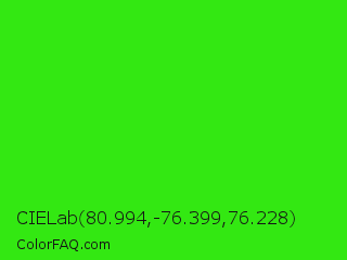 CIELab 80.994,-76.399,76.228 Color is a normal green color and the nearest color is Neon Green #39ff14. Hex code #33e812 and RGB value is rgb(51,232,18). In RGB color space, this color is composed of 20% red, 91% green, 7% blue, In CMYK color space, this color is composed of 78% cyan, 0% magenta, 92% yellow , 9% black , In HSL color space, this color has a hue angle of 111° , 86% saturation and 49% lightness.