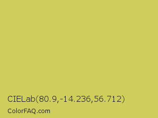 CIELab 80.9,-14.236,56.712 Color is a normal yellow color and the nearest color is Tacha #d6c562. Hex code #d0ce5a and RGB value is rgb(208,206,90). In RGB color space, this color is composed of 82% red, 81% green, 35% blue, In CMYK color space, this color is composed of 0% cyan, 1% magenta, 57% yellow , 18% black , In HSL color space, this color has a hue angle of 59° , 56% saturation and 58% lightness.