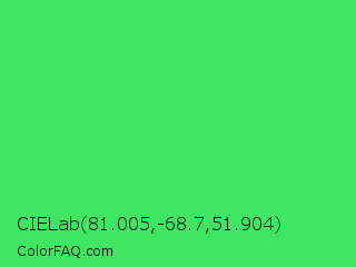 CIELab 81.005,-68.7,51.904 Color is a normal green color and the nearest color is UFO Green #3cd070. Hex code #3ee661 and RGB value is rgb(62,230,97). In RGB color space, this color is composed of 24% red, 90% green, 38% blue, In CMYK color space, this color is composed of 73% cyan, 0% magenta, 58% yellow , 10% black , In HSL color space, this color has a hue angle of 133° , 77% saturation and 57% lightness.