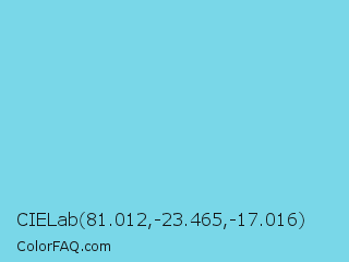 CIELab 81.012,-23.465,-17.016 Color is a light cyan color and the nearest color is Sky Blue #76d7ea. Hex code #79d7e8 and RGB value is rgb(121,215,232). In RGB color space, this color is composed of 47% red, 84% green, 91% blue, In CMYK color space, this color is composed of 48% cyan, 7% magenta, 0% yellow , 9% black , In HSL color space, this color has a hue angle of 189° , 71% saturation and 69% lightness.