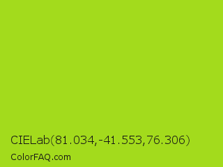 CIELab 81.034,-41.553,76.306 Color is a normal lime color and the nearest color is Inch Worm #b0e313. Hex code #a3db1c and RGB value is rgb(163,219,28). In RGB color space, this color is composed of 64% red, 86% green, 11% blue, In CMYK color space, this color is composed of 26% cyan, 0% magenta, 87% yellow , 14% black , In HSL color space, this color has a hue angle of 78° , 77% saturation and 48% lightness.