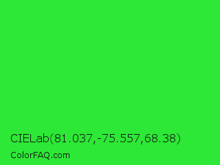 CIELab 81.037,-75.557,68.38 Color is a normal green color and the nearest color is Lime Green #32cd32. Hex code #2de836 and RGB value is rgb(45,232,54). In RGB color space, this color is composed of 18% red, 91% green, 21% blue, In CMYK color space, this color is composed of 81% cyan, 0% magenta, 77% yellow , 9% black , In HSL color space, this color has a hue angle of 123° , 80% saturation and 54% lightness.