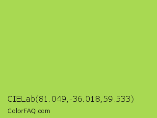 CIELab 81.049,-36.018,59.533 Color is a normal green color and the nearest color is Conifer #acdd4d. Hex code #a8d952 and RGB value is rgb(168,217,82). In RGB color space, this color is composed of 66% red, 85% green, 32% blue, In CMYK color space, this color is composed of 23% cyan, 0% magenta, 62% yellow , 15% black , In HSL color space, this color has a hue angle of 82° , 64% saturation and 59% lightness.