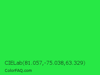 CIELab 81.057,-75.038,63.329 Color is a normal green color and the nearest color is Malachite #0bda51. Hex code #27e845 and RGB value is rgb(39,232,69). In RGB color space, this color is composed of 15% red, 91% green, 27% blue, In CMYK color space, this color is composed of 83% cyan, 0% magenta, 70% yellow , 9% black , In HSL color space, this color has a hue angle of 129° , 81% saturation and 53% lightness.