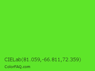 CIELab 81.059,-66.811,72.359 Color is a normal green color and the nearest color is Harlequin Green #46cb18. Hex code #5ee529 and RGB value is rgb(94,229,41). In RGB color space, this color is composed of 37% red, 90% green, 16% blue, In CMYK color space, this color is composed of 59% cyan, 0% magenta, 82% yellow , 10% black , In HSL color space, this color has a hue angle of 103° , 78% saturation and 53% lightness.