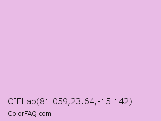 CIELab 81.059,23.64,-15.142 Color is a very light magenta color and the nearest color is French Lilac #ecc7ee. Hex code #e9bbe6 and RGB value is rgb(233,187,230). In RGB color space, this color is composed of 91% red, 73% green, 90% blue, In CMYK color space, this color is composed of 0% cyan, 20% magenta, 1% yellow , 9% black , In HSL color space, this color has a hue angle of 304° , 51% saturation and 82% lightness.