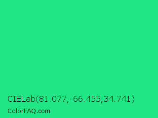 CIELab 81.077,-66.455,34.741 Color is a normal green color and the nearest color is Shamrock #33cc99. Hex code #21e685 and RGB value is rgb(33,230,133). In RGB color space, this color is composed of 13% red, 90% green, 52% blue, In CMYK color space, this color is composed of 86% cyan, 0% magenta, 42% yellow , 10% black , In HSL color space, this color has a hue angle of 150° , 80% saturation and 52% lightness.
