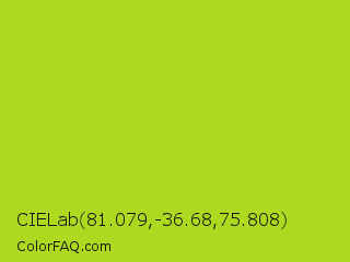CIELab 81.079,-36.68,75.808 Color is a normal lime color and the nearest color is Inch Worm #b0e313. Hex code #add920 and RGB value is rgb(173,217,32). In RGB color space, this color is composed of 68% red, 85% green, 13% blue, In CMYK color space, this color is composed of 20% cyan, 0% magenta, 85% yellow , 15% black , In HSL color space, this color has a hue angle of 74° , 74% saturation and 49% lightness.