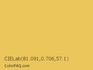 CIELab 81.091,0.706,57.1 Color is a light orange color and the nearest color is Cream Can #f5c85c. Hex code #eac65b and RGB value is rgb(234,198,91). In RGB color space, this color is composed of 92% red, 78% green, 36% blue, In CMYK color space, this color is composed of 0% cyan, 15% magenta, 61% yellow , 8% black , In HSL color space, this color has a hue angle of 45° , 77% saturation and 64% lightness.
