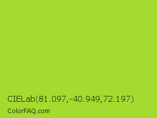 CIELab 81.097,-40.949,72.197 Color is a normal lime color and the nearest color is Yellow Green #9acd32. Hex code #a3db2e and RGB value is rgb(163,219,46). In RGB color space, this color is composed of 64% red, 86% green, 18% blue, In CMYK color space, this color is composed of 26% cyan, 0% magenta, 79% yellow , 14% black , In HSL color space, this color has a hue angle of 79° , 71% saturation and 52% lightness.