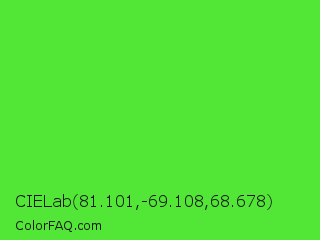 CIELab 81.101,-69.108,68.678 Color is a normal green color and the nearest color is Lime Green #32cd32. Hex code #52e636 and RGB value is rgb(82,230,54). In RGB color space, this color is composed of 32% red, 90% green, 21% blue, In CMYK color space, this color is composed of 64% cyan, 0% magenta, 77% yellow , 10% black , In HSL color space, this color has a hue angle of 110° , 78% saturation and 56% lightness.