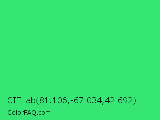 CIELab 81.106,-67.034,42.692 Color is a normal green color and the nearest color is UFO Green #3cd070. Hex code #36e675 and RGB value is rgb(54,230,117). In RGB color space, this color is composed of 21% red, 90% green, 46% blue, In CMYK color space, this color is composed of 77% cyan, 0% magenta, 49% yellow , 10% black , In HSL color space, this color has a hue angle of 141° , 78% saturation and 56% lightness.