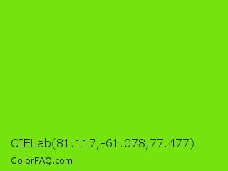 CIELab 81.117,-61.078,77.477 Color is a normal green color and the nearest color is Alien Armpit #84de02. Hex code #74e30e and RGB value is rgb(116,227,14). In RGB color space, this color is composed of 45% red, 89% green, 5% blue, In CMYK color space, this color is composed of 49% cyan, 0% magenta, 94% yellow , 11% black , In HSL color space, this color has a hue angle of 91° , 88% saturation and 47% lightness.