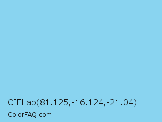 CIELab 81.125,-16.124,-21.04 Color is a light blue color and the nearest color is Baby Blue #89cff0. Hex code #89d4f0 and RGB value is rgb(137,212,240). In RGB color space, this color is composed of 54% red, 83% green, 94% blue, In CMYK color space, this color is composed of 43% cyan, 12% magenta, 0% yellow , 6% black , In HSL color space, this color has a hue angle of 196° , 77% saturation and 74% lightness.