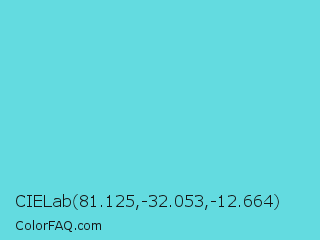 CIELab 81.125,-32.053,-12.664 Color is a light cyan color and the nearest color is Turquoise Blue #6cdae7. Hex code #63dbe0 and RGB value is rgb(99,219,224). In RGB color space, this color is composed of 39% red, 86% green, 88% blue, In CMYK color space, this color is composed of 56% cyan, 2% magenta, 0% yellow , 12% black , In HSL color space, this color has a hue angle of 182° , 67% saturation and 63% lightness.