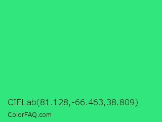 CIELab 81.128,-66.463,38.809 Color is a normal green color and the nearest color is UFO Green #3cd070. Hex code #30e67d and RGB value is rgb(48,230,125). In RGB color space, this color is composed of 19% red, 90% green, 49% blue, In CMYK color space, this color is composed of 79% cyan, 0% magenta, 46% yellow , 10% black , In HSL color space, this color has a hue angle of 145° , 78% saturation and 55% lightness.