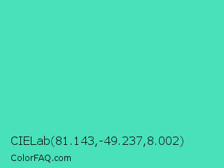 CIELab 81.143,-49.237,8.002 Color is a normal cyan color and the nearest color is Eucalyptus #44d7a8. Hex code #48e1b9 and RGB value is rgb(72,225,185). In RGB color space, this color is composed of 28% red, 88% green, 73% blue, In CMYK color space, this color is composed of 68% cyan, 0% magenta, 18% yellow , 12% black , In HSL color space, this color has a hue angle of 164° , 72% saturation and 58% lightness.