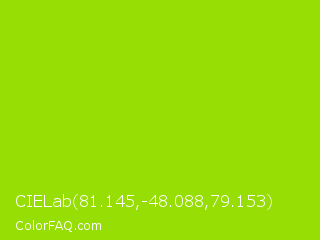 CIELab 81.145,-48.088,79.153 Color is a normal green color and the nearest color is Sheen Green #8fd400. Hex code #96de03 and RGB value is rgb(150,222,3). In RGB color space, this color is composed of 59% red, 87% green, 1% blue, In CMYK color space, this color is composed of 32% cyan, 0% magenta, 99% yellow , 13% black , In HSL color space, this color has a hue angle of 80° , 97% saturation and 44% lightness.