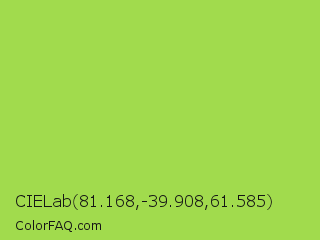 CIELab 81.168,-39.908,61.585 Color is a normal green color and the nearest color is Conifer #acdd4d. Hex code #a1db4d and RGB value is rgb(161,219,77). In RGB color space, this color is composed of 63% red, 86% green, 30% blue, In CMYK color space, this color is composed of 26% cyan, 0% magenta, 65% yellow , 14% black , In HSL color space, this color has a hue angle of 85° , 66% saturation and 58% lightness.