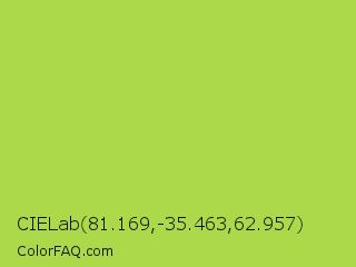 CIELab 81.169,-35.463,62.957 Color is a normal lime color and the nearest color is Conifer #acdd4d. Hex code #abd94a and RGB value is rgb(171,217,74). In RGB color space, this color is composed of 67% red, 85% green, 29% blue, In CMYK color space, this color is composed of 21% cyan, 0% magenta, 66% yellow , 15% black , In HSL color space, this color has a hue angle of 79° , 65% saturation and 57% lightness.