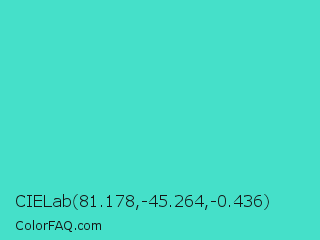 CIELab 81.178,-45.264,-0.436 Color is a normal cyan color and the nearest color is Turquoise #40e0d0. Hex code #45e0c9 and RGB value is rgb(69,224,201). In RGB color space, this color is composed of 27% red, 88% green, 79% blue, In CMYK color space, this color is composed of 69% cyan, 0% magenta, 10% yellow , 12% black , In HSL color space, this color has a hue angle of 171° , 71% saturation and 57% lightness.