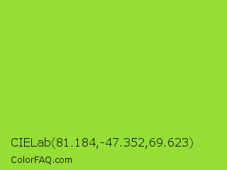 CIELab 81.184,-47.352,69.623 Color is a normal green color and the nearest color is Kiwi #8ee53f. Hex code #94de36 and RGB value is rgb(148,222,54). In RGB color space, this color is composed of 58% red, 87% green, 21% blue, In CMYK color space, this color is composed of 33% cyan, 0% magenta, 76% yellow , 13% black , In HSL color space, this color has a hue angle of 86° , 72% saturation and 54% lightness.