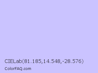 CIELab 81.185,14.548,-28.576 Color is a very light indigo color and the nearest color is Melrose #c7c1ff. Hex code #cac3ff and RGB value is rgb(202,195,255). In RGB color space, this color is composed of 79% red, 76% green, 100% blue, In CMYK color space, this color is composed of 21% cyan, 24% magenta, 0% yellow , 0% black , In HSL color space, this color has a hue angle of 247° , 100% saturation and 88% lightness.