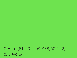 CIELab 81.191,-59.488,60.112 Color is a normal green color and the nearest color is Kiwi #8ee53f. Hex code #6ee34f and RGB value is rgb(110,227,79). In RGB color space, this color is composed of 43% red, 89% green, 31% blue, In CMYK color space, this color is composed of 52% cyan, 0% magenta, 65% yellow , 11% black , In HSL color space, this color has a hue angle of 107° , 73% saturation and 60% lightness.