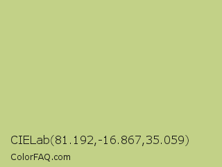 CIELab 81.192,-16.867,35.059 Color is a light lime color and the nearest color is Pine Glade #c7cd90. Hex code #c2d187 and RGB value is rgb(194,209,135). In RGB color space, this color is composed of 76% red, 82% green, 53% blue, In CMYK color space, this color is composed of 7% cyan, 0% magenta, 35% yellow , 18% black , In HSL color space, this color has a hue angle of 72° , 45% saturation and 67% lightness.
