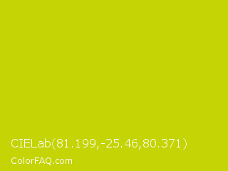 CIELab 81.199,-25.46,80.371 Color is a normal yellow color and the nearest color is Rio Grande #bbd009. Hex code #c4d404 and RGB value is rgb(196,212,4). In RGB color space, this color is composed of 77% red, 83% green, 2% blue, In CMYK color space, this color is composed of 8% cyan, 0% magenta, 98% yellow , 17% black , In HSL color space, this color has a hue angle of 65° , 96% saturation and 42% lightness.