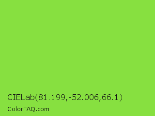 CIELab 81.199,-52.006,66.1 Color is a normal green color and the nearest color is Kiwi #8ee53f. Hex code #87e040 and RGB value is rgb(135,224,64). In RGB color space, this color is composed of 53% red, 88% green, 25% blue, In CMYK color space, this color is composed of 40% cyan, 0% magenta, 71% yellow , 12% black , In HSL color space, this color has a hue angle of 93° , 72% saturation and 56% lightness.