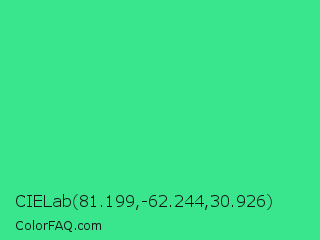 CIELab 81.199,-62.244,30.926 Color is a normal green color and the nearest color is Shamrock #33cc99. Hex code #39e58d and RGB value is rgb(57,229,141). In RGB color space, this color is composed of 22% red, 90% green, 55% blue, In CMYK color space, this color is composed of 75% cyan, 0% magenta, 38% yellow , 10% black , In HSL color space, this color has a hue angle of 149° , 77% saturation and 56% lightness.