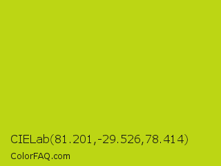 CIELab 81.201,-29.526,78.414 Color is a normal yellow color and the nearest color is Fuego #bede0d. Hex code #bcd614 and RGB value is rgb(188,214,20). In RGB color space, this color is composed of 74% red, 84% green, 8% blue, In CMYK color space, this color is composed of 12% cyan, 0% magenta, 91% yellow , 16% black , In HSL color space, this color has a hue angle of 68° , 83% saturation and 46% lightness.