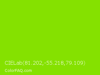 CIELab 81.202,-55.218,79.109 Color is a normal green color and the nearest color is Alien Armpit #84de02. Hex code #85e100 and RGB value is rgb(133,225,0). In RGB color space, this color is composed of 52% red, 88% green, 0% blue, In CMYK color space, this color is composed of 41% cyan, 0% magenta, 100% yellow , 12% black , In HSL color space, this color has a hue angle of 85° , 100% saturation and 44% lightness.