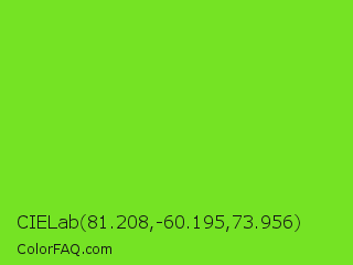 CIELab 81.208,-60.195,73.956 Color is a normal green color and the nearest color is Spring Frost #87ff2a. Hex code #75e324 and RGB value is rgb(117,227,36). In RGB color space, this color is composed of 46% red, 89% green, 14% blue, In CMYK color space, this color is composed of 48% cyan, 0% magenta, 84% yellow , 11% black , In HSL color space, this color has a hue angle of 95° , 77% saturation and 52% lightness.