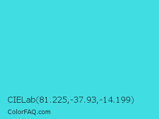 CIELab 81.225,-37.93,-14.199 Color is a normal cyan color and the nearest color is Turquoise #40e0d0. Hex code #40dee3 and RGB value is rgb(64,222,227). In RGB color space, this color is composed of 25% red, 87% green, 89% blue, In CMYK color space, this color is composed of 72% cyan, 2% magenta, 0% yellow , 11% black , In HSL color space, this color has a hue angle of 182° , 74% saturation and 57% lightness.