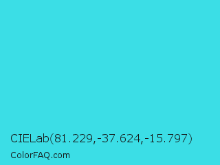 CIELab 81.229,-37.624,-15.797 Color is a normal cyan color and the nearest color is Turquoise #40e0d0. Hex code #3bdee6 and RGB value is rgb(59,222,230). In RGB color space, this color is composed of 23% red, 87% green, 90% blue, In CMYK color space, this color is composed of 74% cyan, 3% magenta, 0% yellow , 10% black , In HSL color space, this color has a hue angle of 183° , 77% saturation and 57% lightness.