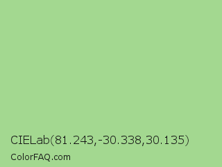 CIELab 81.243,-30.338,30.135 Color is a light green color and the nearest color is Feijoa #9fdd8c. Hex code #a3d890 and RGB value is rgb(163,216,144). In RGB color space, this color is composed of 64% red, 85% green, 56% blue, In CMYK color space, this color is composed of 25% cyan, 0% magenta, 33% yellow , 15% black , In HSL color space, this color has a hue angle of 104° , 48% saturation and 71% lightness.