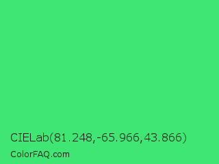 CIELab 81.248,-65.966,43.866 Color is a normal green color and the nearest color is UFO Green #3cd070. Hex code #40e673 and RGB value is rgb(64,230,115). In RGB color space, this color is composed of 25% red, 90% green, 45% blue, In CMYK color space, this color is composed of 72% cyan, 0% magenta, 50% yellow , 10% black , In HSL color space, this color has a hue angle of 138° , 77% saturation and 58% lightness.