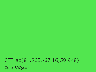 CIELab 81.265,-67.16,59.948 Color is a light green color and the nearest color is Screamin Green #66ff66. Hex code #52e64f and RGB value is rgb(82,230,79). In RGB color space, this color is composed of 32% red, 90% green, 31% blue, In CMYK color space, this color is composed of 64% cyan, 0% magenta, 66% yellow , 10% black , In HSL color space, this color has a hue angle of 119° , 75% saturation and 61% lightness.
