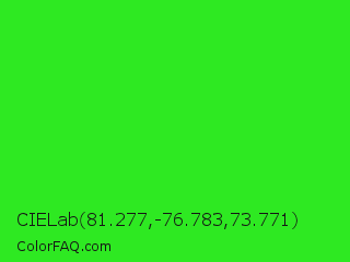 CIELab 81.277,-76.783,73.771 Color is a normal green color and the nearest color is Neon Green #39ff14. Hex code #2ee922 and RGB value is rgb(46,233,34). In RGB color space, this color is composed of 18% red, 91% green, 13% blue, In CMYK color space, this color is composed of 80% cyan, 0% magenta, 85% yellow , 9% black , In HSL color space, this color has a hue angle of 116° , 82% saturation and 52% lightness.