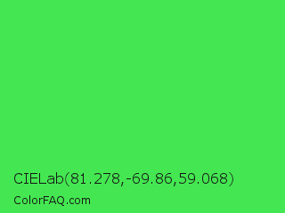 CIELab 81.278,-69.86,59.068 Color is a normal green color and the nearest color is UFO Green #3cd070. Hex code #44e751 and RGB value is rgb(68,231,81). In RGB color space, this color is composed of 27% red, 91% green, 32% blue, In CMYK color space, this color is composed of 71% cyan, 0% magenta, 65% yellow , 9% black , In HSL color space, this color has a hue angle of 125° , 77% saturation and 59% lightness.