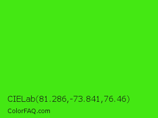CIELab 81.286,-73.841,76.46 Color is a normal green color and the nearest color is Neon Green #39ff14. Hex code #44e813 and RGB value is rgb(68,232,19). In RGB color space, this color is composed of 27% red, 91% green, 7% blue, In CMYK color space, this color is composed of 71% cyan, 0% magenta, 92% yellow , 9% black , In HSL color space, this color has a hue angle of 106° , 85% saturation and 49% lightness.