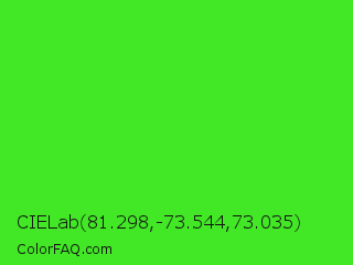 CIELab 81.298,-73.544,73.035 Color is a normal green color and the nearest color is Neon Green #39ff14. Hex code #42e826 and RGB value is rgb(66,232,38). In RGB color space, this color is composed of 26% red, 91% green, 15% blue, In CMYK color space, this color is composed of 72% cyan, 0% magenta, 84% yellow , 9% black , In HSL color space, this color has a hue angle of 111° , 81% saturation and 53% lightness.