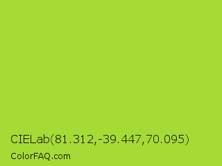 CIELab 81.312,-39.447,70.095 Color is a normal lime color and the nearest color is Yellow Green #9acd32. Hex code #a6db36 and RGB value is rgb(166,219,54). In RGB color space, this color is composed of 65% red, 86% green, 21% blue, In CMYK color space, this color is composed of 24% cyan, 0% magenta, 75% yellow , 14% black , In HSL color space, this color has a hue angle of 79° , 70% saturation and 54% lightness.