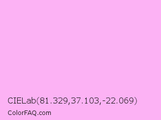 CIELab 81.329,37.103,-22.069 Color is a very light magenta color and the nearest color is Electric Lavender #f4bbff. Hex code #fcb2f4 and RGB value is rgb(252,178,244). In RGB color space, this color is composed of 99% red, 70% green, 96% blue, In CMYK color space, this color is composed of 0% cyan, 29% magenta, 3% yellow , 1% black , In HSL color space, this color has a hue angle of 306° , 93% saturation and 84% lightness.
