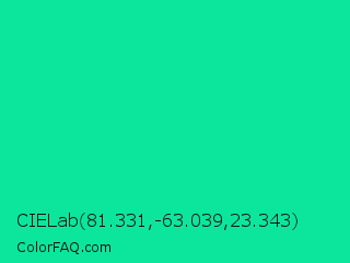 CIELab 81.331,-63.039,23.343 Color is a normal green color and the nearest color is Medium Spring Green #00fa9a. Hex code #0ce69c and RGB value is rgb(12,230,156). In RGB color space, this color is composed of 5% red, 90% green, 61% blue, In CMYK color space, this color is composed of 95% cyan, 0% magenta, 32% yellow , 10% black , In HSL color space, this color has a hue angle of 160° , 90% saturation and 47% lightness.