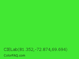 CIELab 81.352,-72.874,69.694 Color is a normal green color and the nearest color is Lime Green #32cd32. Hex code #42e833 and RGB value is rgb(66,232,51). In RGB color space, this color is composed of 26% red, 91% green, 20% blue, In CMYK color space, this color is composed of 72% cyan, 0% magenta, 78% yellow , 9% black , In HSL color space, this color has a hue angle of 115° , 80% saturation and 55% lightness.