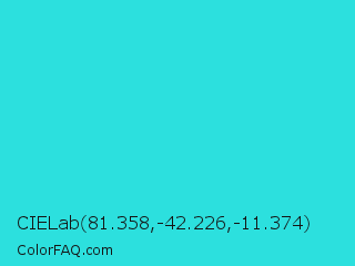 CIELab 81.358,-42.226,-11.374 Color is a normal cyan color and the nearest color is Turquoise #40e0d0. Hex code #2ce0de and RGB value is rgb(44,224,222). In RGB color space, this color is composed of 17% red, 88% green, 87% blue, In CMYK color space, this color is composed of 80% cyan, 0% magenta, 1% yellow , 12% black , In HSL color space, this color has a hue angle of 179° , 74% saturation and 53% lightness.