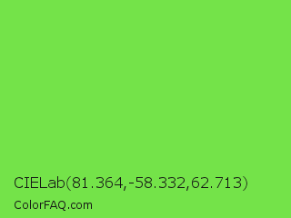 CIELab 81.364,-58.332,62.713 Color is a normal green color and the nearest color is Kiwi #8ee53f. Hex code #74e349 and RGB value is rgb(116,227,73). In RGB color space, this color is composed of 45% red, 89% green, 29% blue, In CMYK color space, this color is composed of 49% cyan, 0% magenta, 68% yellow , 11% black , In HSL color space, this color has a hue angle of 103° , 73% saturation and 59% lightness.